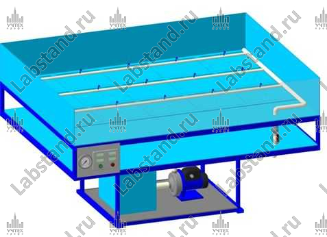 Состав: рамная конструкция, поддон с прозрачной крышкой и перфорированным дном для сбора распыляемой воды, модель системы капельного полива, бак для воды, насос, регулирующие задвижки, манометр, расходомер, мерные стаканы для установки под поддон (для измерения количества воды на единицу площади).
