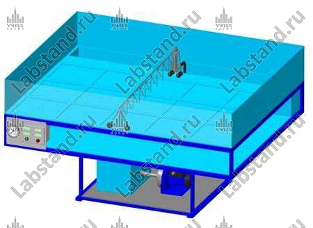 Состав: рамная конструкция, поддон с прозрачной крышкой и перфорированным дном для сбора распыляемой воды и коробом, имитирующим оросительный канал, модель системы орошения полей фронтального типа с двумя самоходными стойками, бак для воды, насос, регулирующие задвижки, манометр, расходомер, мерные стаканы для установки под поддон (для измерения количества воды на единицу площади).