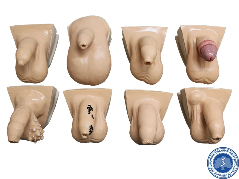 Тренажер позволяет получить навыки физикального осмотра полового члена, мошонки с расположенными в ней яичками, их придатков и семявыносящего протока. Осмотр производится в естественном для осмотра половых органов положении – вертикально. На тренажере представлены следующие виды сменных имитаций половых органов: