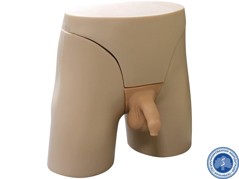 Тренажер представляет собой анатомическую модель нижней части туловища мужчины с проксимальными фрагментами бедер, установленную на основании. Модель имеет средние антропометрические размеры брюшной и тазовой полостей, съемный блок в области промежности с имитацией наружных половых органов. Тактильные свойства сменных блоков с патологиями приближены к их реальным характеристикам.