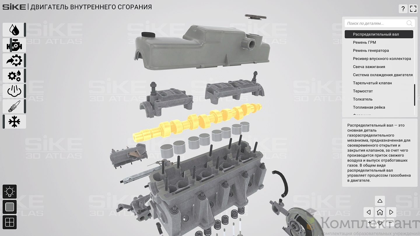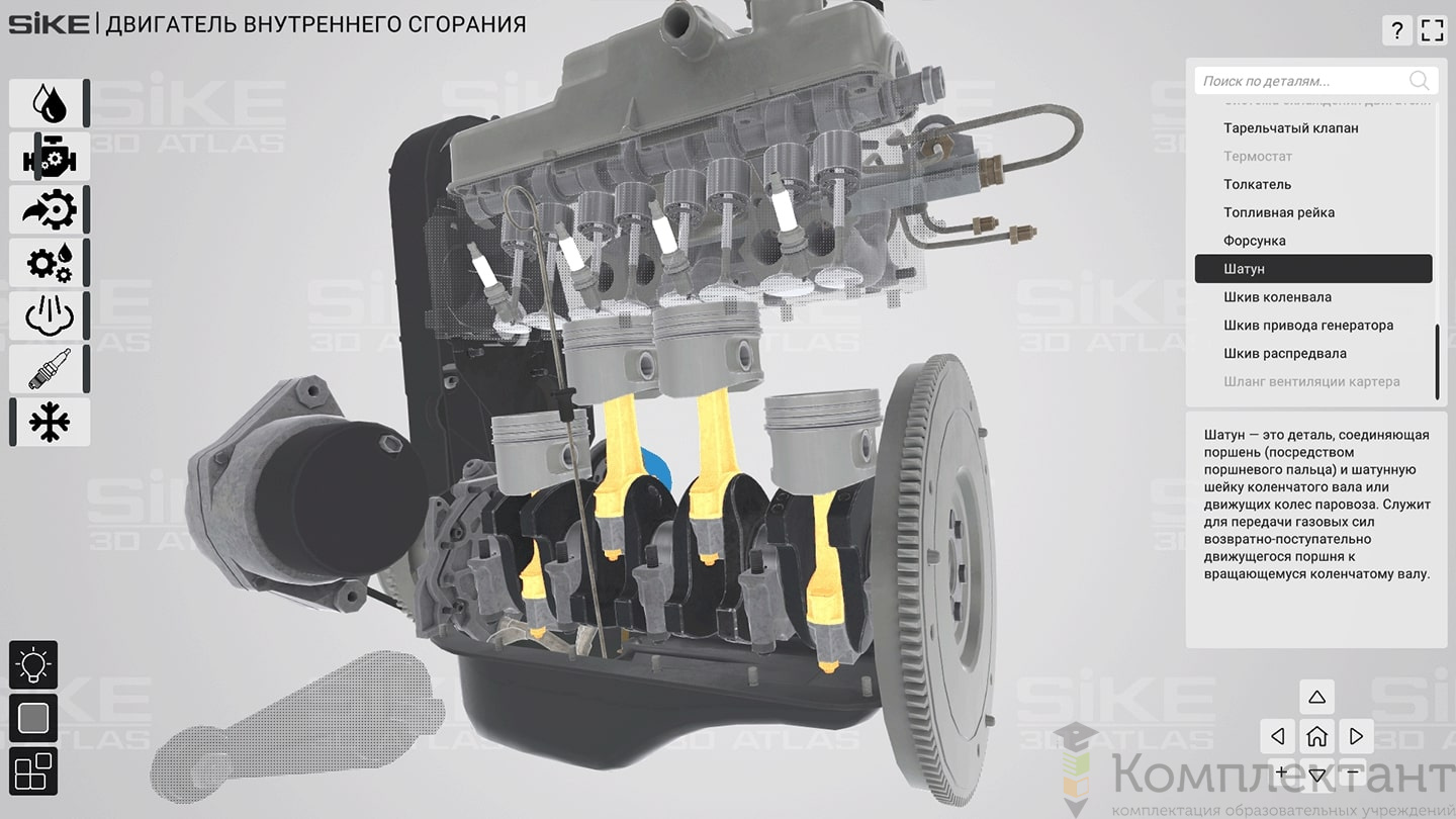 3D Атлас «Устройство двигателя внутреннего сгорания» дает возможность пользователю детально изучить устройства оборудования на базе реалистичных 3D моделей. В основе изучения интерактивные 3D модели реального производственного оборудования. В режиме «обучение» пользователь может вращать модель, скрывать отдельные детали, изучать внутреннее устройство, описание и назначение деталей. В режиме «тестирование» пользователь может проверить свой уровень знаний по конструкции оборудования.